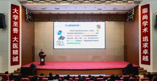 院徽(标)颜色由科技蓝、纯洁白和活力红三色构成。蓝色象征医学教育的科学、严谨、智慧和理性,白色象征医术的圣洁和高尚的医德,红色象征医学教育事业发展的勃勃生机。