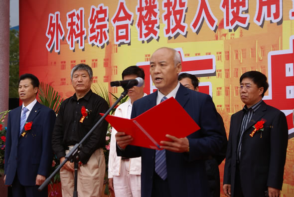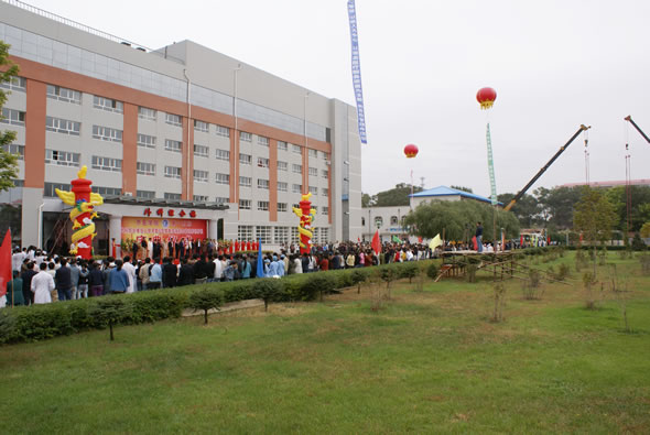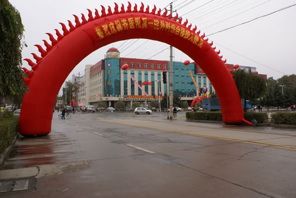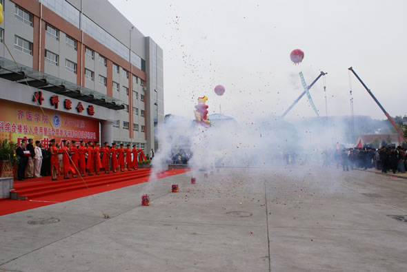 为了庆祝这一来之不易的历史性时刻,医院提前一天就在门前通向城区繁华地带的主要街道上架设了彩虹门,张挂了宣传标语,在医院上空升起了八只硕大的垂吊着五颜六色长幅标语的红气球,早早营造好了庆典气氛。26日清晨,医院经秋雨洗礼更显清新亮丽,离吉庆时刻还有一个小时,停车场已排满了来宾的车辆,两辆吊车就高高吊起了长挂鞭炮,人们怀着喜悦兴奋的心情,静候着庆典仪式的举行。