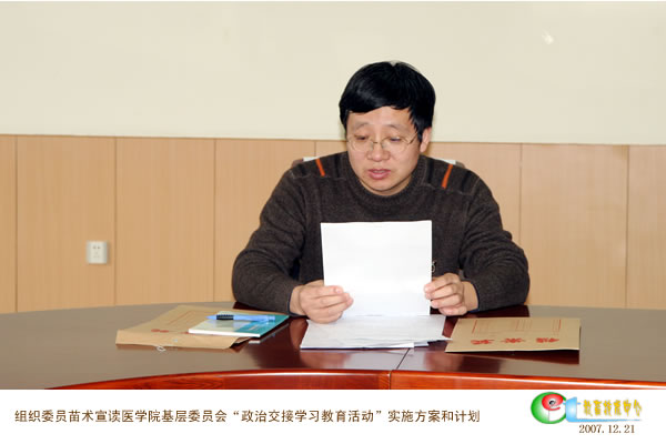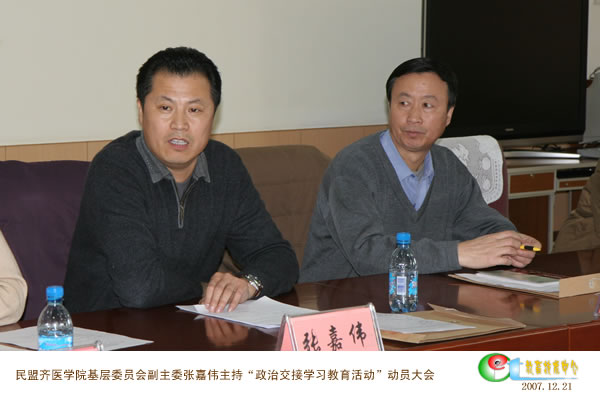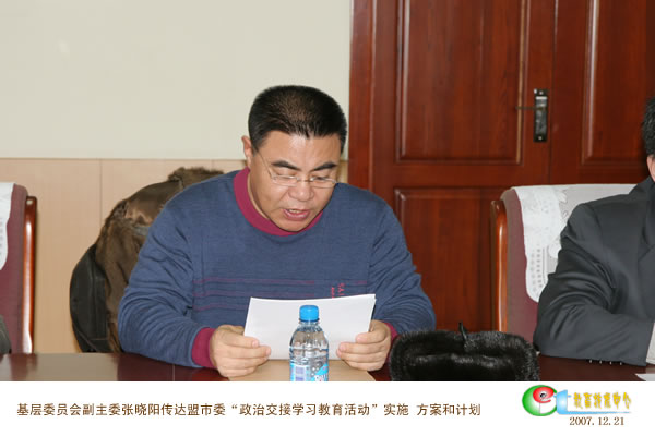 会上,民盟学院基层委员会副主委张晓阳传达了盟市委关于“学习贯彻党的十七大精神暨政治交接学习教育活动”动员大会的会议精神,传达了民盟市委关于“开展‘坚持中国特色社会主义政治发展道路,搞好政治交接’学习教育活动”的实施方案和计划,以及孙建平主委在会上发表的重要讲话内容,明确了开展“政治交接学习教育活动”的目的和意义;民盟学院基层委员会组织委员苗术宣读了民盟学院基层委员会关于“开展‘坚持中国特色社会主义政治发展道路,搞好政治交接’学习教育活动”的实施方案和具体实施计划。