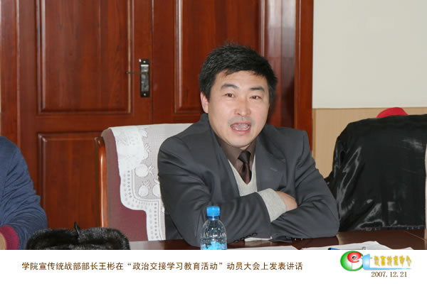 学院党委宣传、统战部长王彬,在动员会上发表重要讲话强调:一要充分认识搞好民主党派“政治交接学习教育活动”的重大意义;二要深刻领会“政治交接学习教育活动”的内涵;三要准确把握“政治交接学习教育活动”的基本原则;四要突出重点,明确开展“政治交接学习教育活动”的具体做法。他在讲话最后指出,“政治交接学习教育活动”,事关民主党派自身建设和发展方向,关系到政治制度的坚持和完善,关系统一战线和多党合作事业的可持续发展,意义和责任十分重大。希望大家积极参与这一学习教育活动,共同探索、实践、总结、推进,努力促使我院的学习教育活动取得良好实效,为我院统一战线工作和多党合作事业续写新的辉煌。