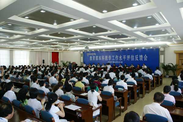 图为教育部本科教学工作水平评估专家组组织我院召开评估工作反馈会时的场景