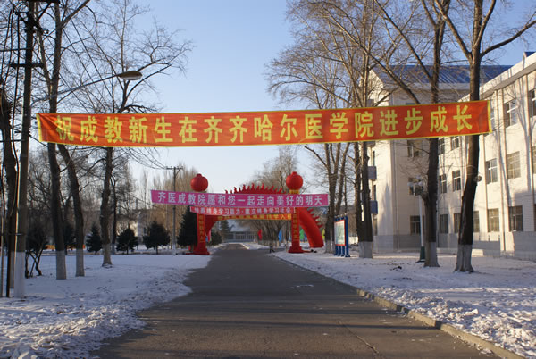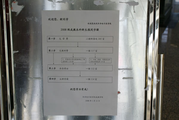 08年元月12~13日,我院校园彩虹门高耸、彩旗飘飘,“热烈欢迎成教新同学入学”、“齐医学院愿和您一起走向美好明天”、“祝成教新生在齐齐哈尔医学院进步成长”、“培养终身学习能力,建立终身学习社会”等迎新横幅标语挂满了校园。在通往新生接待处的楼厅过道上,设置了醒目的新生接待工作流程,看去一目了然。接待处各办公室的门上,明确地标着接待项目,一站式迎新服务设计,极大地方便了新生报到入学。11日上午,成教院院长高金池亲自坐阵,工作人员严阵以待,8时刚刚一过,成教新生开始陆续报到入学……