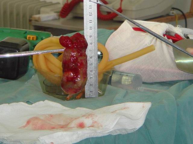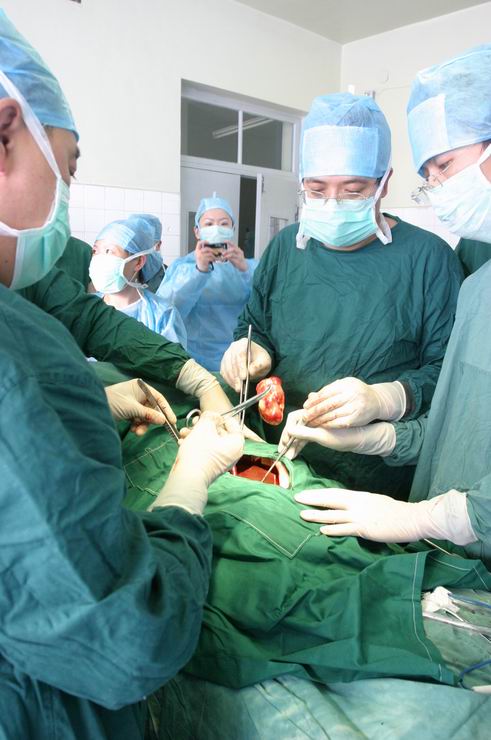来自齐齐哈尔市龙江县七棵树乡的患者马某因为劳动后心慌气短来齐医第一附属医院就诊。经心脏彩色超声、心脏核磁共振检查,胸心外科信国玺主任发现心脏内有一巨大肿瘤,从马某的临床症状,医生诊断为左心房黏液瘤,必须进行手术治疗。肿瘤位于心房内,占据左心房大部分空间,如果肿瘤阻塞二尖瓣口处将会危及患者生命。另外,一旦肿瘤脱落,通过血液循环进入大血管将引起周围血管梗塞,出现相应并发症,丧失劳动能力,瘫痪甚至造成死亡。在经过周密部署的准备下,信国玺主任果断决定为这位患者施行体外循环下心脏肿瘤切除术,一场高风险高难度的手术考验着我们的专家。2月3日11时30分,马某被推上了手术台,经全身麻醉后,借助体外循环机代替心脏工作,清除心脏左心房内肿瘤。经过近4个小时的手术,医生终于顺利成功地将一个10×5×5立方厘米的肿瘤从左心房完整切除,恢复心脏血流通畅,很快心脏恢复了正常跳动,手术宣告成功,目前患者马某的各项生命体症平稳,可以正常进食并和医生进行交流。该手术的成功开展标志着齐市地区心脏肿瘤切除手术零的突破。