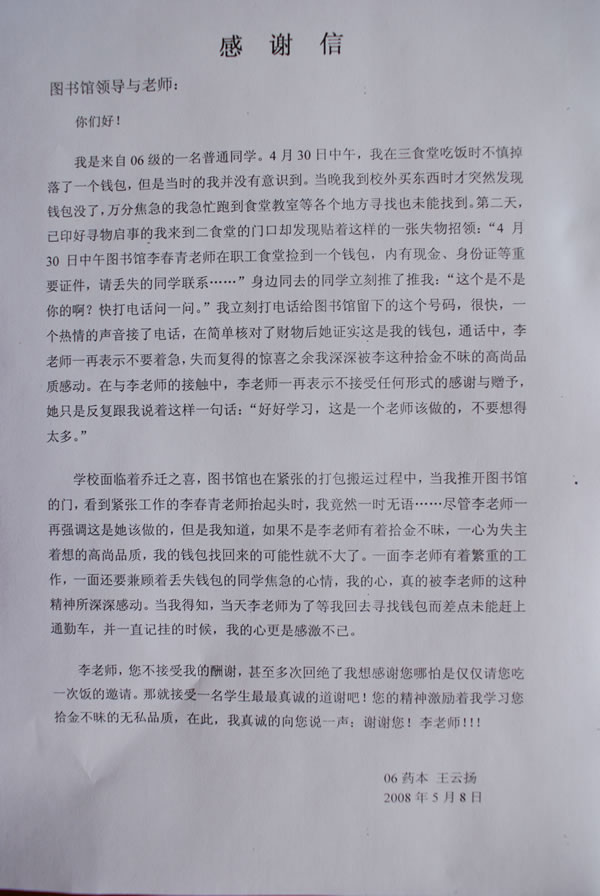 5月8日下午,药学院06级药本专业王云扬同学,满怀感激地走进图书馆馆长办公室,送来一封感谢信,由衷地表达了她对图书馆借阅处李春青老师拾金不昧的感谢。
