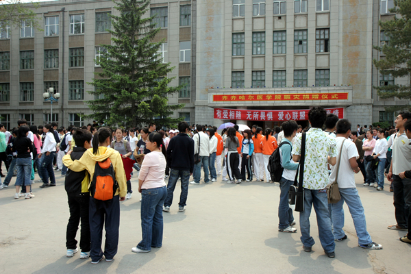 5月16日中午12:30分,齐齐哈尔医学院师生员工汇集在校园主楼门前,为发生地震的四川灾区捐款,奉献爱心!短短20分钟,累计捐款额597079.7元。我校将把捐款移交市民政局,帮助灾区人民重建家园。