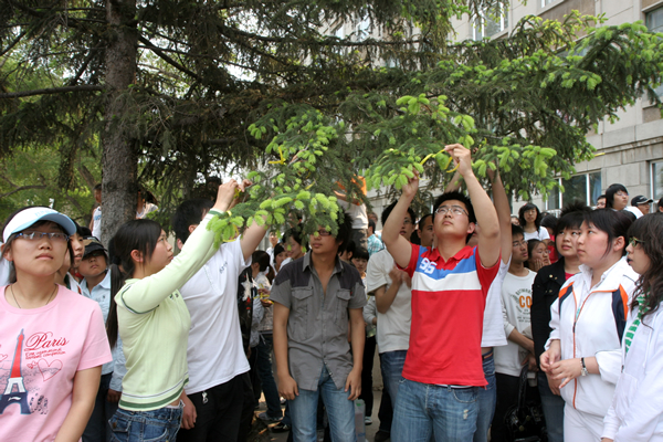 捐款仪式中四川籍的学生还通过系黄丝带的方式,寄托了盼望亲人平安、远离灾难的祝愿。家住北川羌族自治县的陈小庆同学在接受电视台记者采访中寄托了对亲人的哀思和祝愿,表达了对学校的感谢。