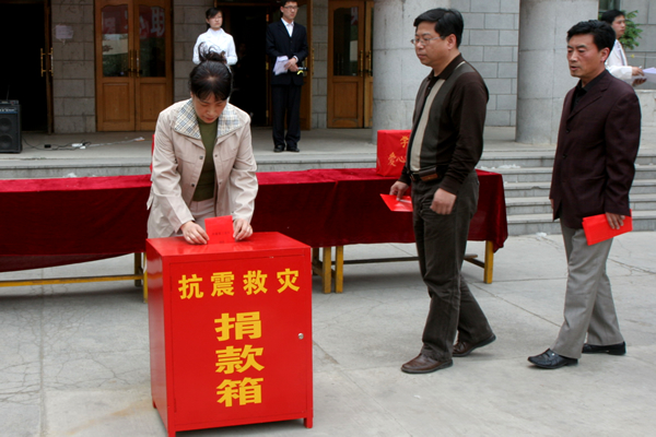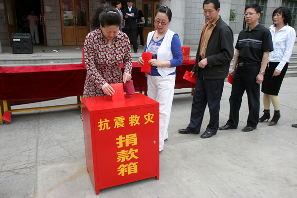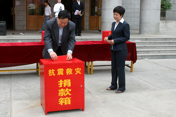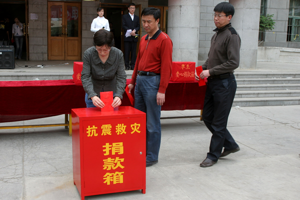 在捐款仪式上学校党委书记邱福利发表了讲话,他代表学校党委和全体师生员工对灾区人民表示深切的同情和慰问,号召全校师生尽自己的绵薄之力,汇聚爱的力量,捐款赈灾,并率先捐款1000元,校长刘吉成,党委副书记姜连清,纪委书记、工会主席谭忠汉,副校长姜凤楼、张际绯、崔光成各捐款1000元。