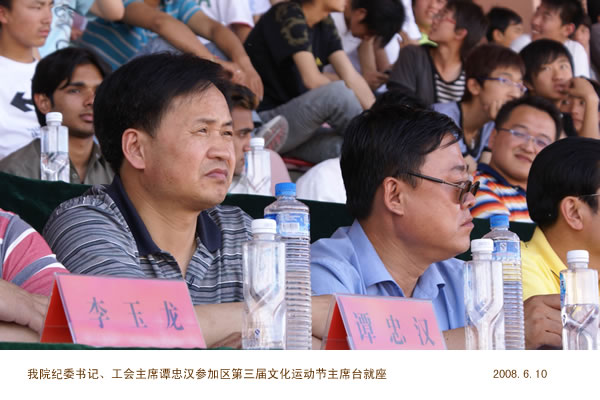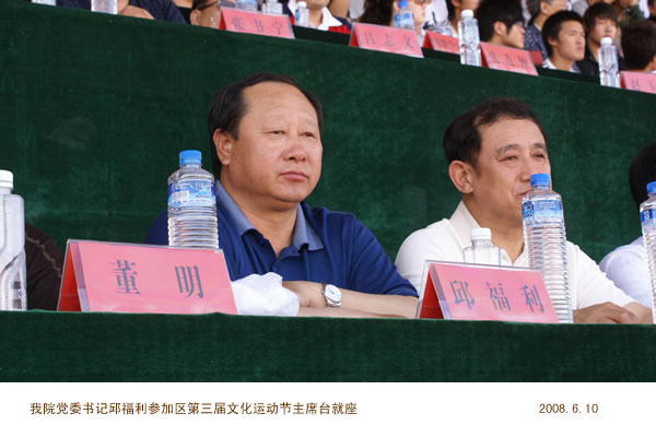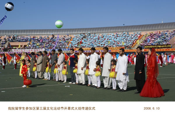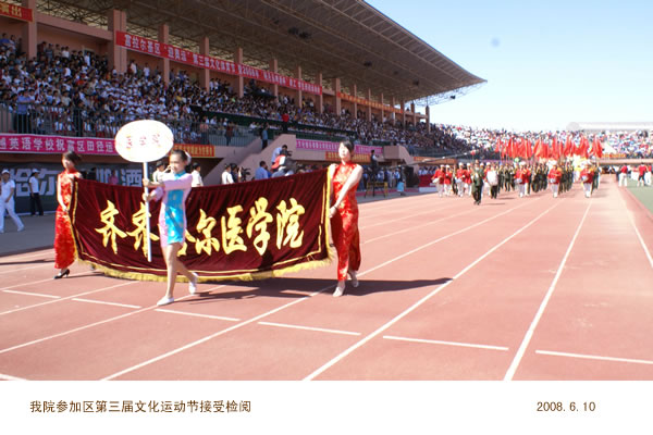 6月10日下午,富区第三届职工学生田径运动会在区运动场举行盛大开幕仪式。我院党委书记邱福利、工会主席谭忠汉出席开幕式并于主席台就座。学院精心组织由校旗、鼓乐队、奥运福娃、彩旗方队等近200人组成的检阅队伍,高奏激扬的乐曲,昂首阔步接受大会检阅,我院巴基斯坦籍留学生身着民族盛装,参与了开幕式奥运圣火传递表演,为盛会开幕平添了亮点,充分展示了齐医风采。