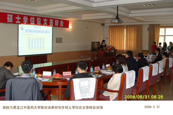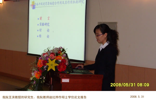 以李冀教授为主席的答辩委员会专家听取了我院与黑龙江中医药大学联合培养的、我院教师王滨教授指导的硕士研究生赵红烨汇报的题为《溃疡平促进胃溃疡愈合作用及其作用机制研究》学位论文,并一致同意其硕士论文答辩通过,建议授予硕士学位。