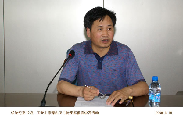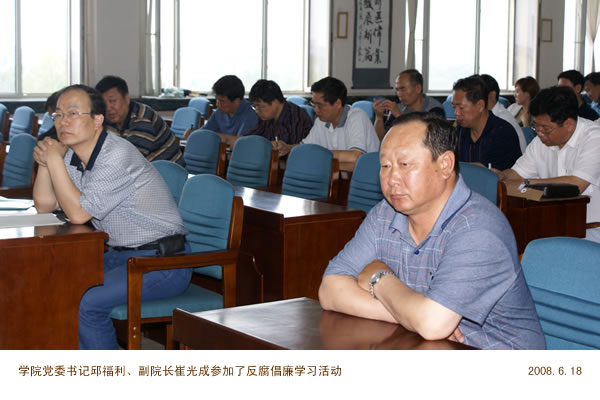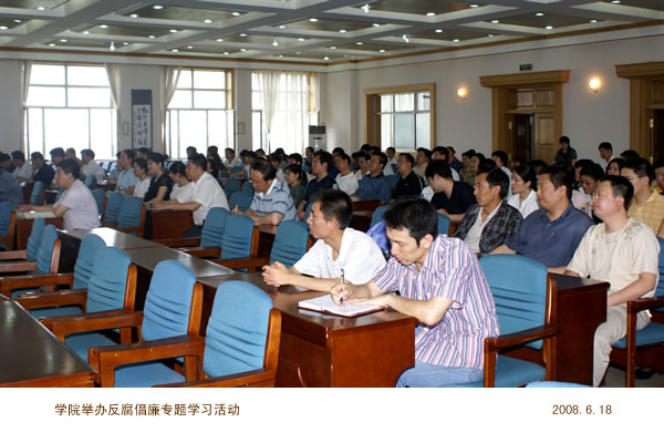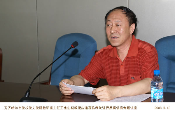 学院纪委为贯彻落实齐纪发[2008]7号《关于开展党的十七大和中纪委二次全会精神专题学习活动的通知》文件的精神,于6月18日下午,特邀齐齐哈尔市委党校党史党建教研室副主任王宝忠副教授,为院本部副科级以上干部、教研室主任、机关一般干部及附属医院领导班子成员作了题为《坚决惩治和预防腐败是一项长期重大的政治任务》的专题讲座。讲座由学院纪委书记、工会主席谭忠汉主持,学院党委书记邱福利、副院长崔光成参加了本次学习活动。