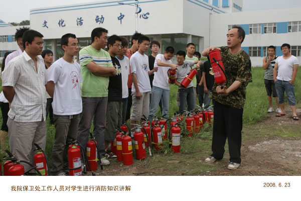 在此基础上,学院保卫处趁热打铁,于6月23日安排了由各院系辅导员、班主任教师、班级干部参加的消防灭火实战演练。由保卫处工作人员讲解灭火器的使用方法和基本灭火常识以及日常生活中应注意的安全事项,并制造火灾现场。同学们根据理论指导,进入演练现场,进行火灾扑救,取得了理想的效果。