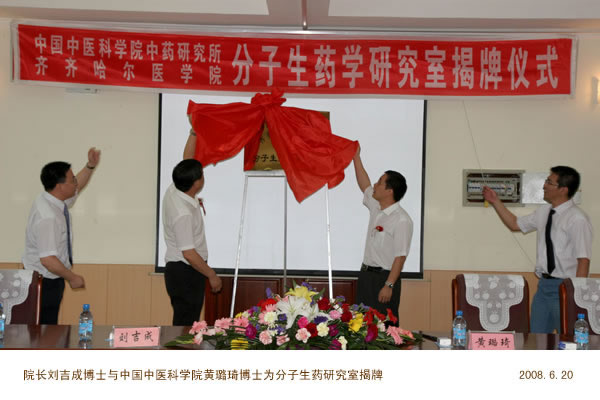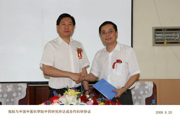6月,我院与中国中医科学院中药研究所本着资源共享、互惠互利的原则,建立了科研合作关系,并共同在我院组建了分子生药学研究室。我院院长刘吉成博士和中国中医科学院中药研究所所长黄璐琦博士为研究室揭牌。