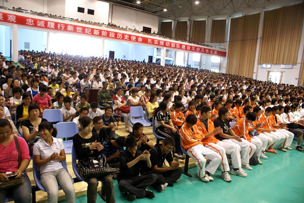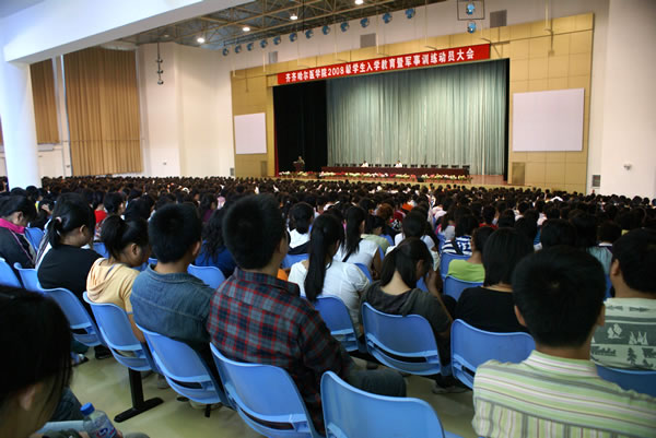 9月2日,我院2008级2700余名新生在驻齐某部队礼堂接受入学教育。大会由学院学工部部长姜国庆主持,各二级学院辅导员、新生班主任参加大会。