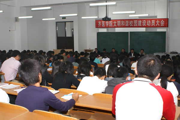 学院党委书记邱福利发表了动员讲话,他就如何做好和谐校园建设工作提出了指导意见:希望广大教职员工要统一思想,提高认识,充分认识和谐校园建设的重大意义,并且要坚持方向,协调发展,牢牢把握和谐校园建设的指导思想、总体要求和基本原则;在建设过程中突出重点,明确任务,着力构建和谐校园,同时要加强领导,齐抓共管,切实保障和谐校园建设各项任务落到实处。他在讲话中提出“和谐凝聚人心,和谐激发活力,和谐推动发展,和谐成就事业”,并以此激励全院师生员工坚定信心,团结奉献,同舟共济,为建设社会主义和谐社会做出积极贡献,为建设新齐医贡献更大力量。