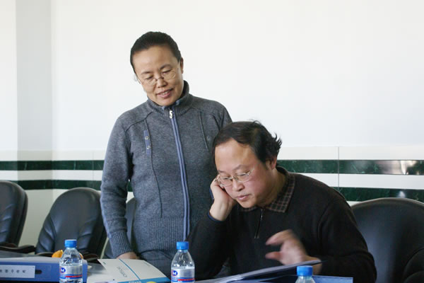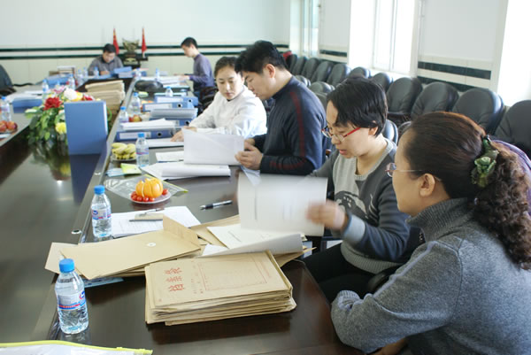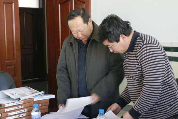 学院党委书记邱福利与宣传部长王彬认真查看档案