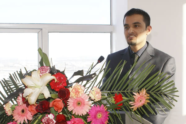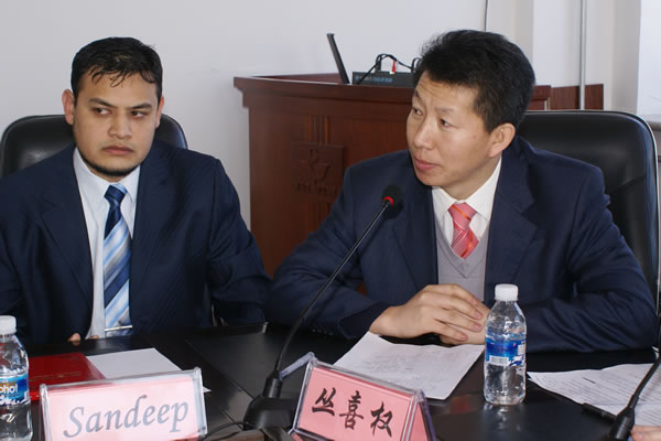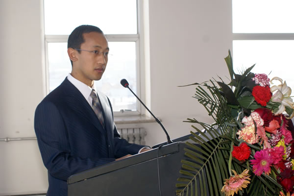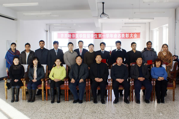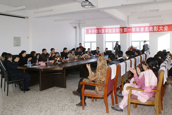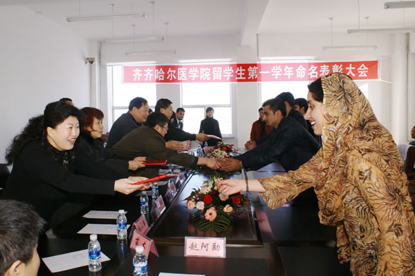 会议由外事处副处长丛喜权主持。会上,学院党委副书记姜连清宣读了《关于命名表彰我院外国留学生纳维德等11名同学的决定》。参会领导为11名受表彰的留学生颁发了荣誉证书。留学生代表艾哈迈德和外教代表阿龙在会上用汉语发言,表达了他们在齐齐哈尔医学院学习和生活的愉快心情,并对院领导和外事处工作人员以及相关部门对他们一年多来的关心和照顾表示感谢。院长刘吉成用流利的英语发表了热情洋溢的讲话。他首先对受到表彰的留学生表示祝贺,并全面地介绍了学院的发展状况、一年来中国与巴基斯坦关系的健康发展、奥运会的成功举办及神舟七号的成功发射。最后刘吉成院长对留学生今后的学习和生活提出了殷切的希望。