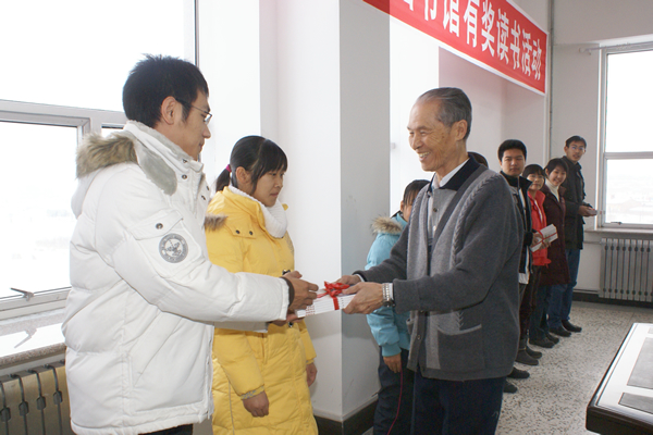 张际绯院长到会并讲话,为王老师捐赠的《校园深处》做了书评,高度赞扬了老教师对学院的深厚感情以及他们对学院发展建设的热情关注及身体力行,同时,对师生们提出了要求和期望,希望大家继续加强学习,不断提高自己,为学院的发展贡献才智。她还为最佳教师读者颁发了奖品。院办、组织部两个部门协助组织并参加了本次活动。