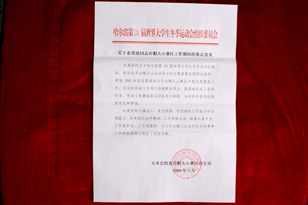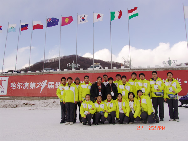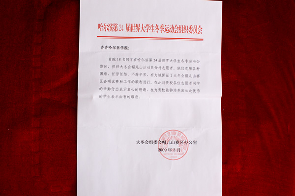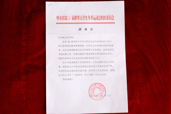 在本次大冬会上,我院有18名同学荣幸地成为志愿者,承担帽儿山赛区的兴奋剂检测和接待服务等工作。从2月11日进入赛区到2月28日大冬会闭幕,他们始终坚守在冰天雪地的工作岗位,满怀激情,积极主动,认真负责,高效率、高质量地完成了全部任务,他们的工作态度和工作成绩受到国内外运动员、大冬会组委会、兴奋剂检查部和其他兄弟院校的高度评价,大冬会组委会为我院大学生志愿者的出色表现还专门向我院发来感谢信,兴奋剂检测专家向我院赠送了纪念品,衣英欣老师也因为优异的工作表现受到大冬会组委会的表扬。