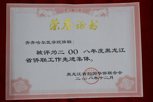 我院侨联组织在学院党委统战部领导下,认真贯彻落实省、市侨联文件指示精神,积极组织成员开展参观学习活动,组织成员中知名专家下乡义诊,因其工作成绩突出被黑龙江省归国华侨联合会评为2008年度黑龙江省侨联工作先进集体。 我院侨联获得先进集体荣誉证书