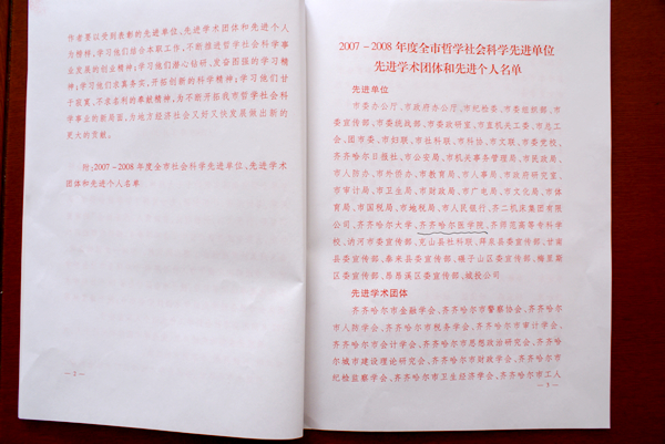 2009年3月30日,齐齐哈尔市社会科学工作会议隆重召开。此次会议上,我院被齐齐哈尔市委、齐齐哈尔市人民政府授予2007—2008年度全市哲学社会科学先进单位荣誉称号。此次共有46个单位作为繁荣发展我市哲学社会科学事业,推动我市经济社会又好又快发展做出突出贡献的先进典型受到表彰。学院党委副书记、市社联兼职副主席姜连清同志代表学院参加了会议。
