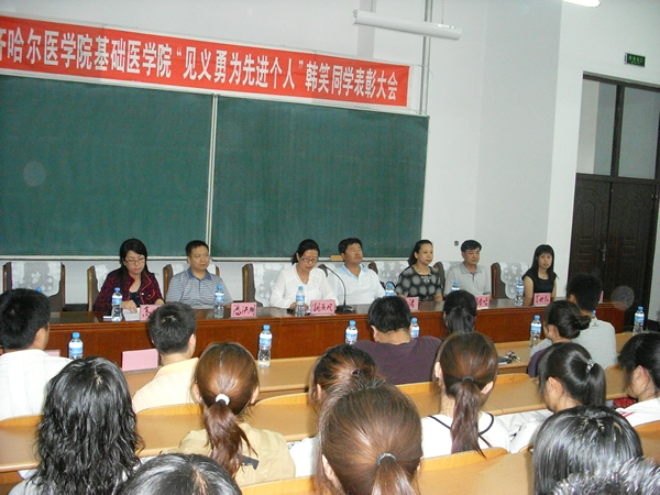 6月24日下午,基础医学院召开大会对见义勇为先进个人韩笑同学进行表彰奖励。会议由基础医学院党委书记胡亚凡主持,院长李涛宣读了表彰决定并为韩笑同学颁发了荣誉证书和奖金。党委书记胡亚凡高度赞扬韩笑同学为广大共青团员树立了典范,号召全院团员青年要学习韩笑同学的见义勇为精神,从自身做起,从现在做起,争当文明大学生,为构建文明和谐校园做出应有的贡献。基础医学院团委也就学习韩笑同学的见义勇为行为发起了倡议。会上,被救人韩德强讲述了被救经过,并对我院培养出这样优秀的大学生表示钦佩。据悉,鹤城晚报两度对韩笑同学见义勇为的突出表现进行宣传报道,赢得了广泛的社会赞誉,韩笑同学对学校的培养表示感谢,并谦虚地表示会再接再厉,争优创先。