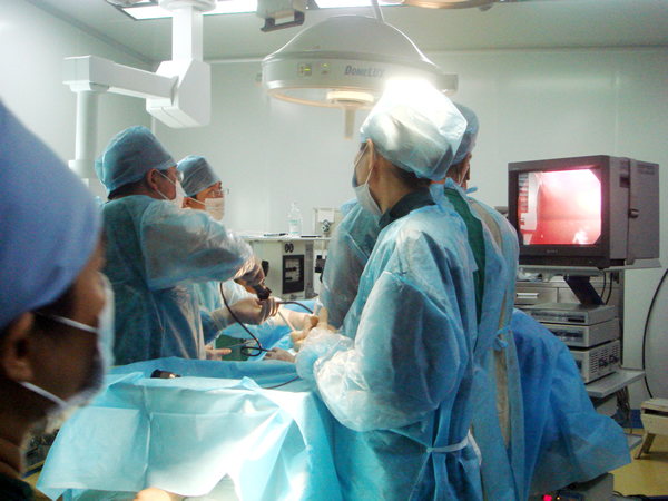 7月24日,附属第一医院胸外科在哈医大专家的指导和全体医护人员的共同努力下,成功为一位18岁学生进行了切除肺大泡胸腔镜手术。胸腔镜手术是一项微创胸部手术技术,具有创伤小、痛苦轻、恢复快的特点,此类手术在齐富地区尚属首例。它的成功,标志着附属一院的微创手术水平又迈上了一个新台阶。 (附属第一医院2009年7月27日供稿) 医生在实施手术