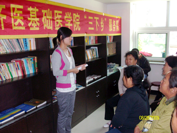 8月28日,由基础医学院22名青年志愿者组成的医疗服务队在基础医学院团委的带领下,深入到建华区方兴新村小区开展以“构建和谐社会,共塑红色青春”为主题的社会实践活动,志愿者为居民作了题为《“甲型流感”预防》的知识讲座,还为居民义务测量血压、体温、脉搏、化验血型,对群众的问医问药进行详细认真解答。8月29日上午,医学技术学院团总支书记陈敏老师带领该院暑期社会实践服务团一行30人来到齐齐哈尔市雅尔赛镇奈门沁村开展了义诊活动,他们走访农户、发放传单,为当地的农民朋友们宣传常见疾病的症状及预防措施,并针对新型农村合作医疗制度进行了问卷调查。8月27日,护理学院开展了“松鹤家园老年公寓”送温暖活动,15名同学为老人们进行了常规体检,并送去了一场温馨的文艺演出。