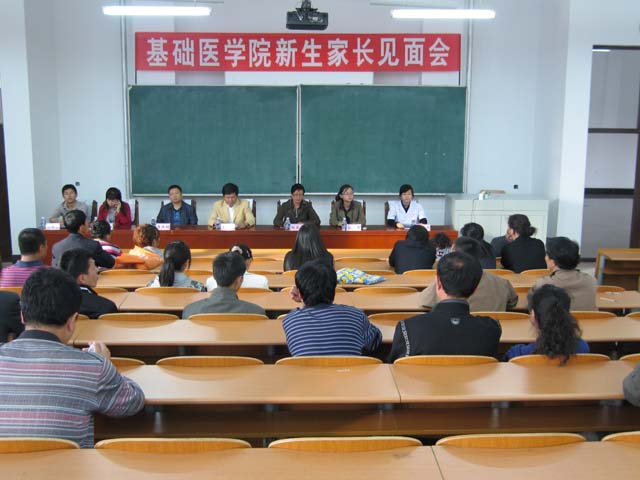 为了帮助新生家长了解学校,促进家长与学校沟通合作,基础医学院于2009年9月18日和19日下午召开了2009级新生家长见面会。基础医学院党委书记胡亚凡、院长李涛、副院长潘洪明、办公室主任孙贺、辅导办副主任逄丽红、全体2009级新生班主任及部分2009级新生家长参加了此次见面会,会议由胡亚凡书记主持。