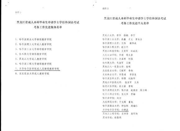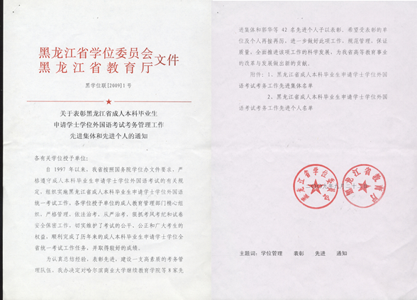 2009年9月下旬,省学位办召开成人学位工作总结大会。会议对历年的学位工作进行了认真总结,并提出了本年度的工作计划。为建设一支高素质的考务管理队伍,省学位办首次对全省25个负责成人学位考务管理工作的单位进行了评选,对其中考务管理突出的8家单位和43名个人进行了表彰,我院成人及继续教育学院喜获考务管理工作先进集体荣誉称号,白艳晶同志被评为考务管理工作先进个人。(成教学院2009年10月12日供稿)