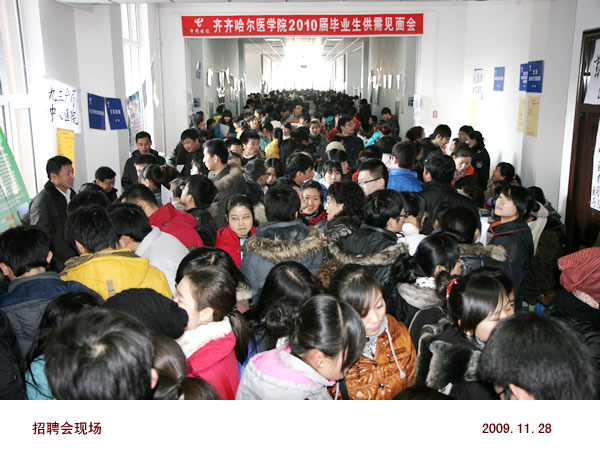 2010届毕业生供需见面会11月28日在主楼北区隆重举行。来自北京、辽宁,吉林、广东、浙江、内蒙古、云南等省内外的59家医药卫生机构前来参会,其中有些单位是慕名而来,有些单位则是“老熟人”。此次他们为毕业生带来就业岗位820个,影像、病理、护理、精神等专业方向都深受用人单位青睐。招聘会吸引了应届毕业生1300余人前来寻找就业契机,他们共投出简历1523份,52名同学现场与用人单位签订了协议,据学工部门预计,会后还将有近300名毕业生与用人单位签订意向性协议。
