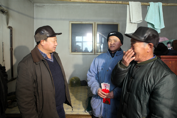 当日,学院党委书记邱福利一行来到贫困户杨宏伟家时,他早已站在风雪中迎接邱书记一行的到来,邱书记亲切地询问了他的家庭和身体状况,并送上了500元的慰问金,杨宏伟激动得热泪盈眶,紧紧握着邱书记的手再三表示感谢。随后,邱书记又亲自把慰问金送到了王子海和王占江等贫困户手中,并表示学院将随时为他们提供力所能及的帮助,缓解他们的生活压力。