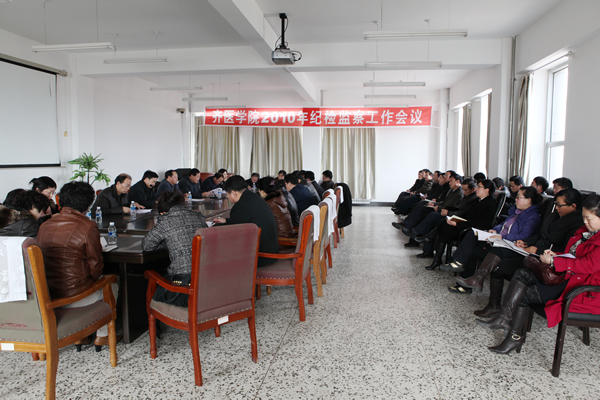 2010年4月2日,学院党委召开了2010年纪检监察工作会议,学院党委书记邱福利到会并作重要讲话。学院党委副书记姜连清主持会议并传达了中央纪委十七届五次全会、省纪委十届六次全会和全省教育系统纪检监察工作会议精神。学院纪委书记、工会主席谭忠汉代表学院纪委总结回顾了过去一年的纪检监察工作,全面部署了2010年反腐倡廉工作。
