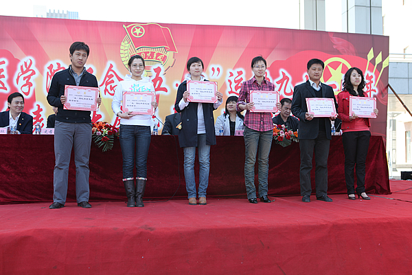 “五•四”青年节当天,院团委在大医广场上举办了纪念“五•四”运动九十一周年命名表彰大会暨大型文艺汇演活动,学院党委副书记姜连清及各院系党总支书记应邀出席了大会,并为获奖学生代表颁奖。大会由团委副书记马倩主持。