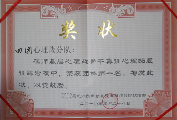 5月24至28日,我院派出18名师生作为预备役心理战骨干,组成心理战分队,参加了高射炮兵师组织的为期5天的基层心理战骨干集训,圆满完成了心理战理论学习和12个室外心理拓展科目训练任务。学院武装部副部长尚天歌带领17名队员在最后考核中,荣获心理拓展训练团体第一名,赵学强和尚天歌包揽心理战理论知识考核前两名,于鹏、包海峰等16人均被评为训练标兵和先进个人。我院参训的18名预备役官兵良好的精神风貌和顽强的工作作风受到了军、师两级首长一致好评。