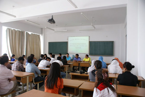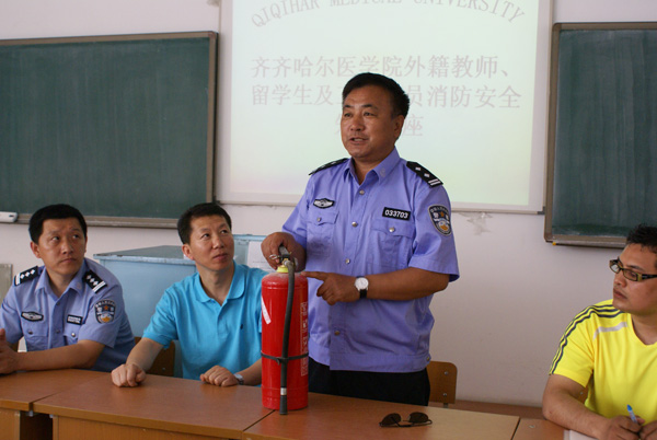 为贯彻落实《齐齐哈尔医学院关于贯彻落实<高等学校消防安全管理规定>实施方案》,增强外籍师生和外事处工作人员的安全意识,培养外籍师生紧急情况下的逃生本领,近日,外事处联合保卫处组织学院全体外籍教师、留学生及外事处工作人员开展了一次生动的消防安全教育讲座,并进行了灭火及逃生演练。