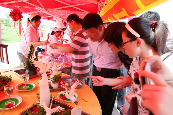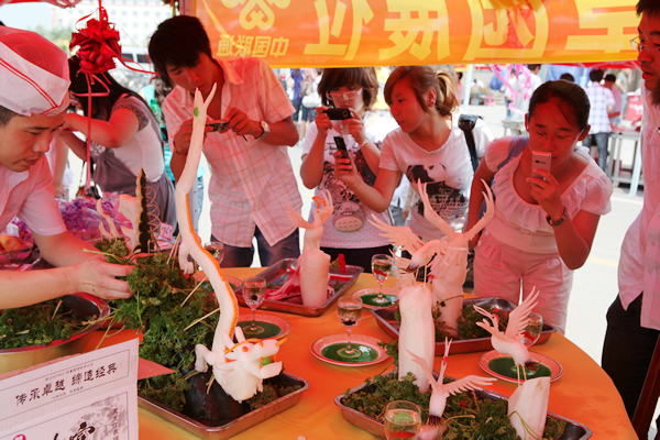 本届美食节上,百草园、紫竹厅和兰花厅三个展区的厨师们纷纷大显身手,展露厨艺,为师生献上了色香味俱佳、营养均衡、物美价廉的珍馐盛宴,参展食品可谓秀色可餐,令人赏心悦目,吸引了一批批师生前来品尝、购买和观赏。芙蓉烧麦、沙拉面包、什锦粽子等百余种中西方主食和菊花里脊、金牌羊腿、松香鲫鱼等百余种荤素副食展品,个个让人垂涎欲滴;巧夺天工的浮雕“大展宏图” “云中白鹤”等雕刻作品引得很多师生驻足拍摄,不忍食用。