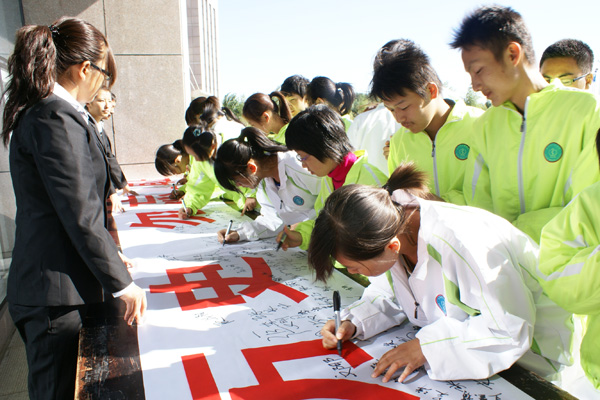 学生在“铭记历史 勿忘国耻”的横幅上签字