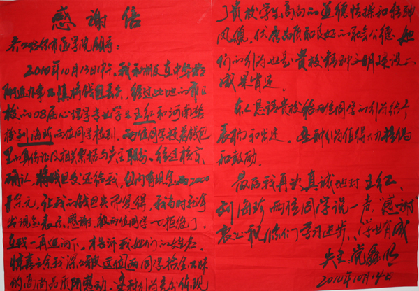 近日,精神卫生学院收到一封感谢信,信中对精神卫生学院2008级临床专业医学心理学方向王虹同学拾金不昧的行为表示感谢。10月13日中午,王虹同学与朋友途经中华路附近时拾到一个钱包,内有2000余元现金和各种证件,王虹同学立刻按照钱包内证件上的信息及时与失主取得联系,将现金和证件完好无损地交还失主。失主面对失而复得且分文不少的钱包,惊喜之余执意要给王虹同学酬金,被王虹同学婉言拒绝了。失主深受感动,专门写来感谢信,对我院学生拾金不昧的行为给予了高度赞扬。(精神卫生学院2010年10月18日供稿)