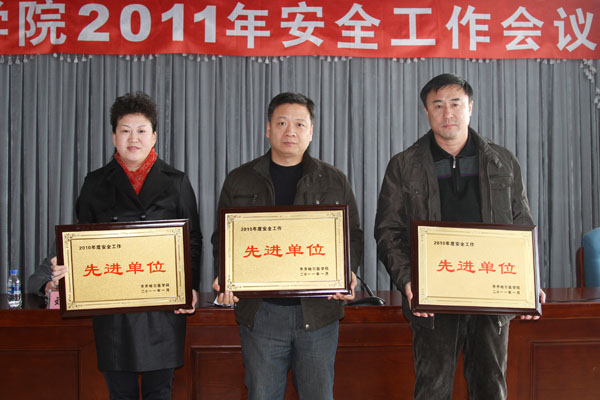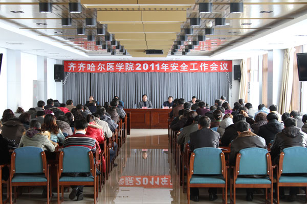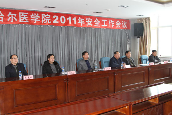 会上,学院党委副书记姜连清传达了市委书记郝会龙和省教育厅副厅长张信关于安全工作的讲话精神,学院副院长崔光成宣读了对安全工作量化考核优秀部门的表彰决定。受到表彰的基础医学院、医学技术学院和后勤服务总公司三个单位的领导上台领取了奖牌。学院院长刘吉成发表重要讲话,充分肯定了学院2010年在安全教育、安全管理、安全防范体系建设等方面取得的成绩,也指出了安全工作中的一些薄弱环节。刘院长要求全院师生员工要认真贯彻落实《黑龙江省学校安全条例》和《学院安全工作量化考核实施细则(试行)》文件的相关精神,继续提高对安全工作的认识与重视,进一步增强做好安全工作的责任感与使命感;加强安全教育、演练和安全监督检查工作;切实抓好宿舍、实验室等重要场所和附属医院等重点单位的安全管理工作,将安全工作落到实处。同时,刘院长总结了十一五期间学院在教学质量、科研水平、社会声誉等方面取得的成绩,希望全院教职工在学院硬件设施逐渐完善的基础上,进一步加强学院内涵建设,要求中层干部做到“自强、自信、务实”,不断提升自身修养和创新能力。