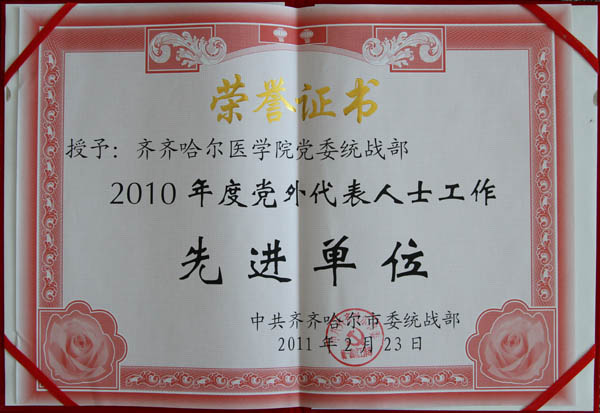 在2月24日召开的2011年全市统战工作会议上,我院党委统战部被授予“2010年度党外代表人士工作先进单位”荣誉称号。这是继获得2010年齐齐哈尔市 “侨联工作先进集体”后,党委统战工作获得的又一项荣誉。