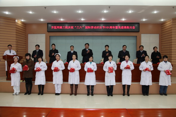 当日,附属三院召开了“庆祝‘三•八’国际劳动妇女节101周年暨先进表彰大会”,医院领导班子成员出席大会并为受到表彰的先进集体和个人颁奖。附属三院党委书记、院长毕红霞对女职工为医院的繁荣发展做出的贡献表示感谢,希望广大职工在学院“十二五”规划开局之年,瞄准方向、树立目标、开拓进取,争取早日实现医院的宏伟目标,同时,毕书记还希望女职工们孝敬父母,构建和谐家庭,做一个内在美与外在美有机融合的时代女性。会后,医院妇产二科主任为广大女职工作了《女性日常保健及常见病预防》知识讲座。