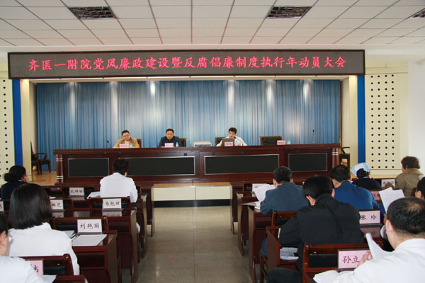 会上,附属一院副院长胡凯宣读了《齐齐哈尔医学院附属第一医院开展反腐倡廉“制度执行年”活动工作方案》,党委书记郭金城对开展反腐倡廉制度执行年活动进行了动员和部署。郭书记希望与会人员强化政治意识、大局意识和责任意识,围绕医院中心工作,扎实开展反腐倡廉制度执行年活动,完善反腐倡廉制度体系建设,确保执行年活动如期、高效完成,为促进医院的科学、和谐、快速发展提供有力保障。