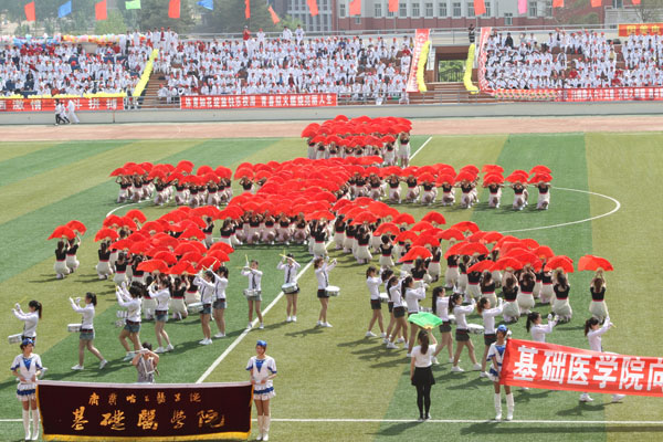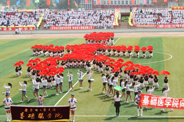 英姿飒爽犹酣战,齐医健儿展风采。领导干部百米赛拉开了此次赛事的序幕,随后各代表队共计500余名运动员参加了跳高、跳远、长跑、短跑等14个项目的角逐。运动员们你争我赶,赛场上的气氛紧张而热烈;团体操方队也为观众献上了一场场气势恢宏、设计巧妙的表演,热情洋溢的青春激情在竞技场上尽情绽放。