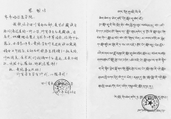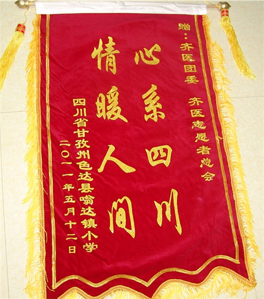 日前,学院团委收到了四川省甘孜州色达县嗡达镇小学校长寄来的锦旗及感谢信。信中对我院志愿者在汶川地震三周年之际,开展 “爱心超市”募捐活动,将募集到的衣物和生活用品邮寄到嗡达镇小学,以此送去齐医学子对该校全体师生祝福的善举表示感谢。嗡达镇小学因地处偏远,办学条件比较落后,学院团委将会继续对其开展资助活动,希望尽自己的绵薄之力,帮助该校学生健康成长,快乐成才。(团委2011年6月7日供稿)