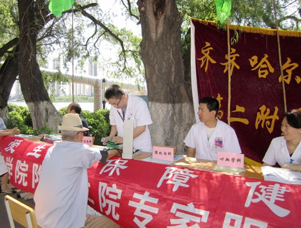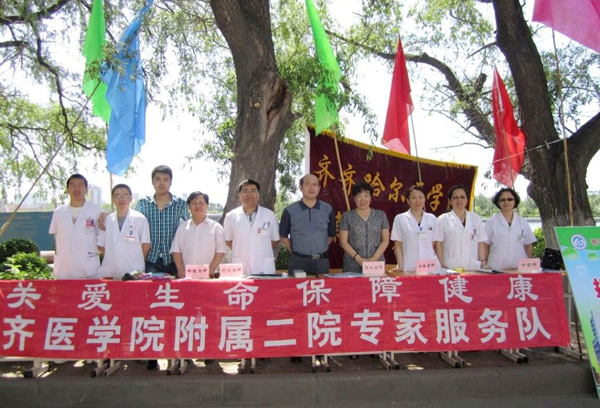 在第八个“世界献血日”上午8点,附属二院副院长孙庆顺带领医务科、宣传科、保健科、神经科、心内科、消化科、呼吸科、口腔科的专家在劳动湖畔开展了宣传和义诊活动,为过往的群众免费测量血压,进行健康咨询,发放宣传单及健康教育处方,受到了群众的欢迎。院长张淑英也赶到现场参加了宣传活动。 今年献血日的主题是“捐献更多血液 挽救更多生命”。 在当日的宣传活动中,附属二院围绕这一主题号召更多的人加入义务献血志愿者行列,定期自愿献血,挽救更多生命。 (附属二院2011年6月29日供稿) 义诊现场 义诊团专家合影