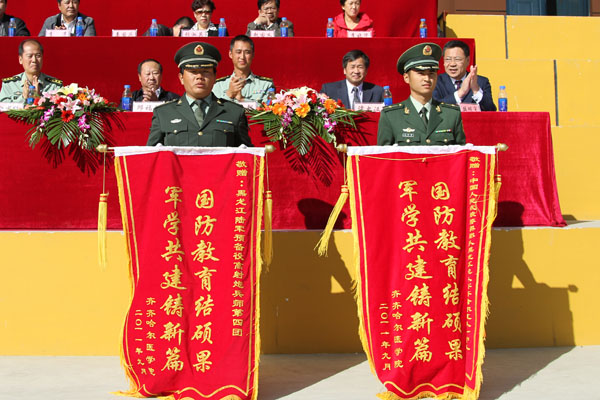在军训总结大会上,学院党委书记邱福利和纪委书记、工会主席谭忠汉向承训部队赠送了锦旗,与会领导为优秀学兵连、优秀学兵寝和优秀学兵代表颁发了荣誉证书和奖状。阅兵式上,各连队服装整齐、步伐矫健、口号响亮,庄严地接受主席台检阅,新生代表还进行了精彩的内务整理、军体拳及战术基本动作表演,展示了军训的突出成果,展现了新时代学子奋发有为的斗志和昂扬向上的精神风貌。