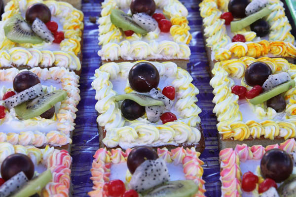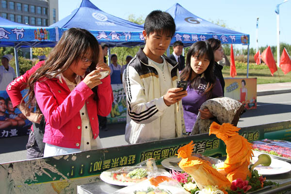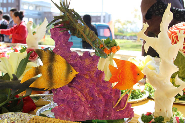 来自春华城二食堂、三食堂、秋实城一食堂、二食堂的厨师们一展身手,准备了花样各异、营养丰富、色香味俱全的美味佳肴,为师生送上了一场赏心悦目的饮食文化盛宴,吸引了众多师生前来品尝、购买。此次美食节共展出了白蓉酥、红蓉酥、什锦蛋糕、岭南酥角、法式长仔包、奶油蛋花糕等近百种中西式主食和“百花争艳”、“飞燕归巢”、“金盘马哈鱼”等荤素搭配的副食,特别是“龙凤呈祥”、“海底世界”等巧夺天工的雕刻作品更为美食节增添了几分艺术气息和文化品位,惹得众人纷纷驻足观赏、拍照,成为美食节上的一大亮点。