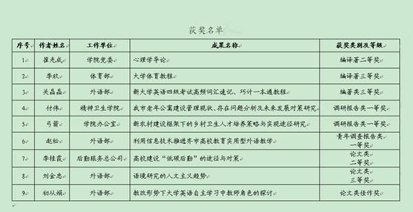 10月13日,齐齐哈尔市社科联召开了第十二届全市哲学社会科学优秀科研成果表彰奖励大会。会上,我院党委副书记崔光成等9名教师的成果获奖。这是我院近年来获奖数量最多的一次。此外,今年4月学院还荣获了“2009—2010年度全市社会科学工作先进单位”称号,同时,学院前任党委副书记姜连清和社科部教师丁万华获得了全市“哲学社会科学工作先进个人”的荣誉称号。 颁奖现场