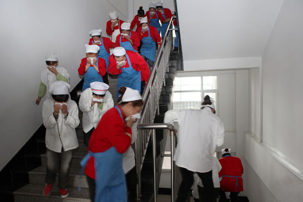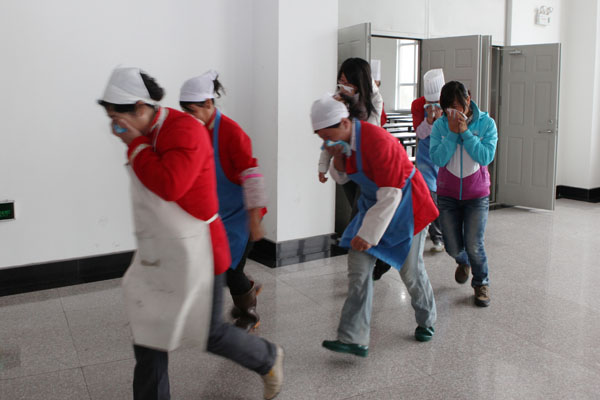 演练中职工和学生迅速离开火灾现场
