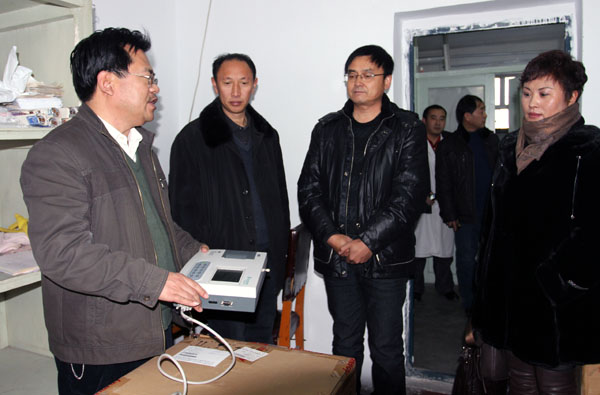 附属一院副院长赵国义为各乡镇卫生院代表演示所捐赠医疗仪器的操作方法